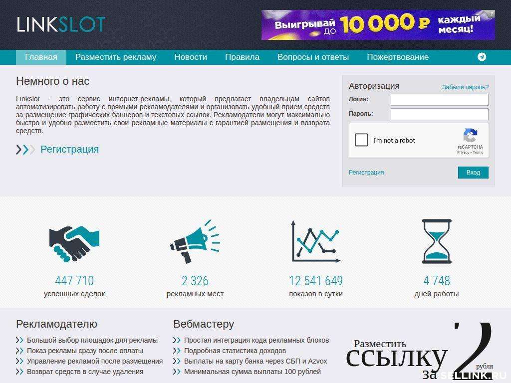 Linkslot - это сервис интернет-рекламы, который предлагает владельцам сайтов автоматизировать работу с прямыми рекламодателями и организовать удобный прием средств за размещение графических баннеров и текстовых ссылок.