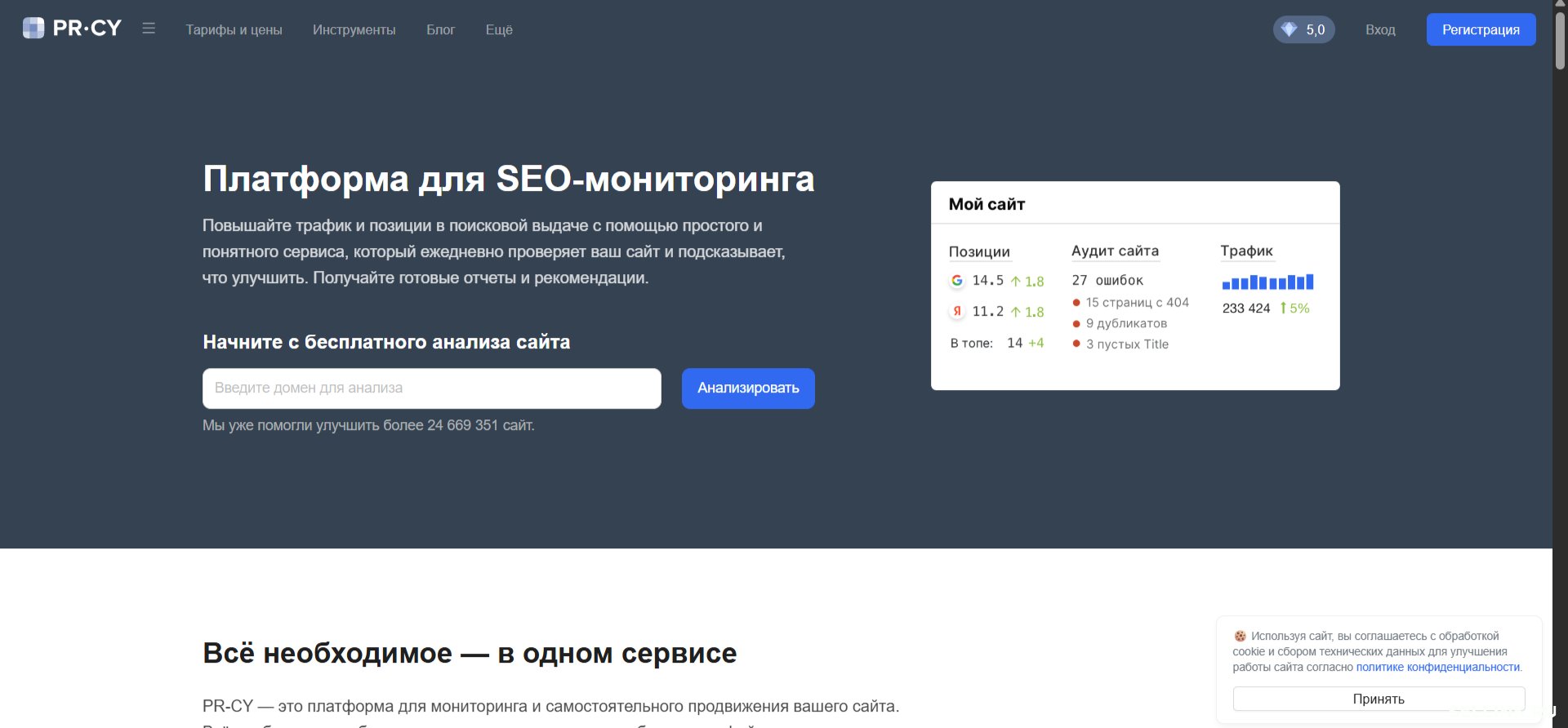 С помощью сервиса PR-CY можно следить за множеством параметров сайта в одном сервисе. Не нужно открывать несколько инструментов, чтобы проверить отношение поисковиков, метатеги, оптимизацию на страницах, проверку позиций и другие параметры — всё есть в одном интерфейсе.